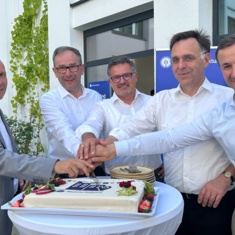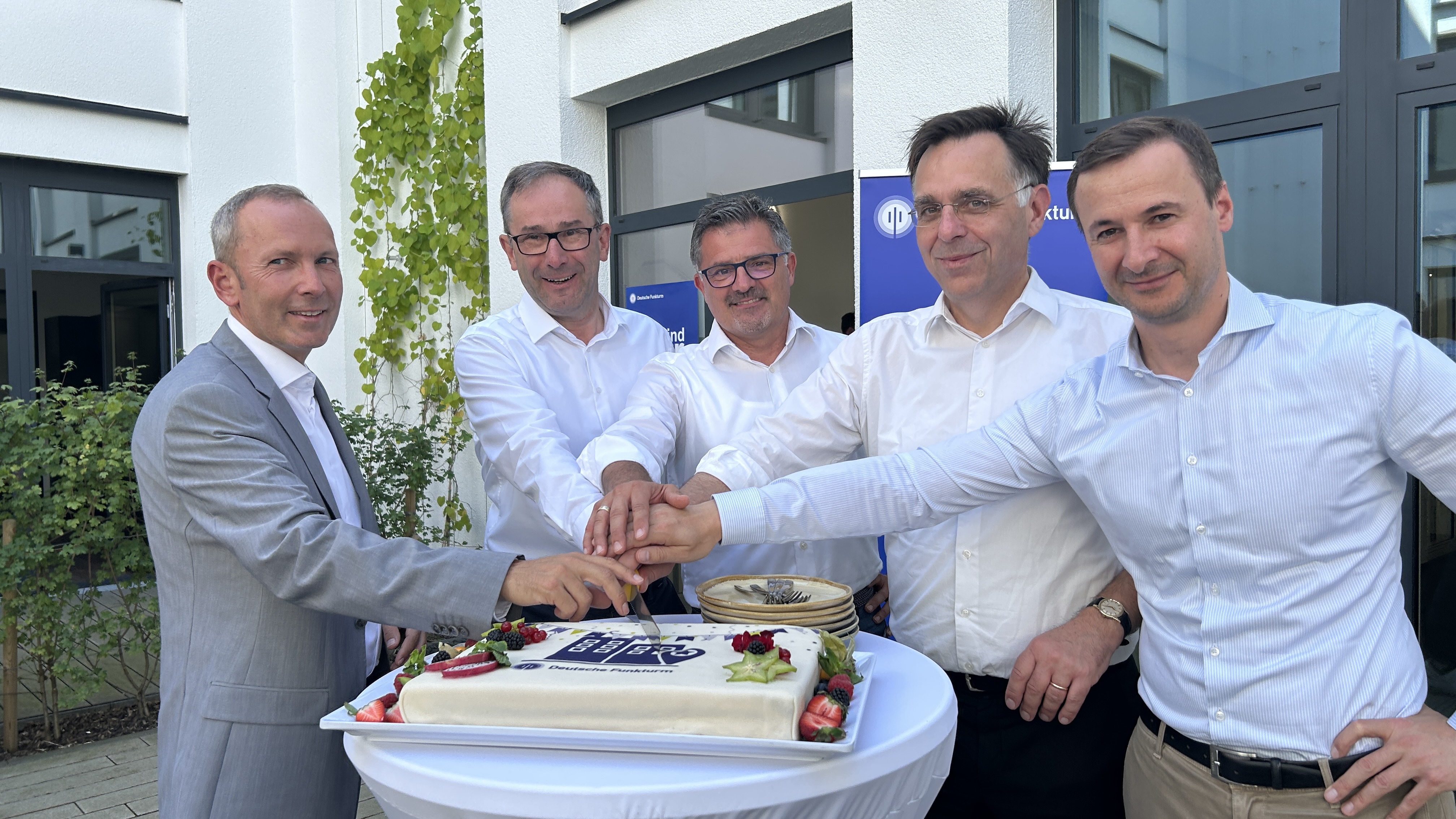 Tortenanschnitt in Leverkusen. V.l.n.r.: Markus Märtens (Wirtschaftsförderung Leverkusen), Bruno Jacobfeuerborn (DFMG), Thomas Ried (DFMG), Samuel Tomic (DFMG) und Philipp Pohlmann (DFMG). Copyright: Deutsche Funkturm
