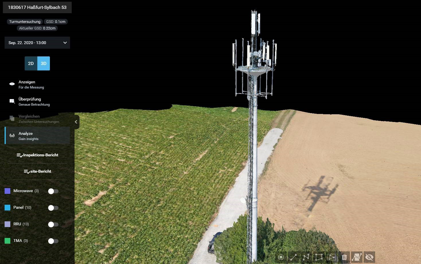 Eine bautechnische Begehung ist eine örtliche Besichtigung und Prüfung des Bauplatzes für die Errichtung eines neuen Funkstandortes. Im Rahmen der BTB werden zentimetergenaue geometrische Messungen vorgenommen, auf deren Grundlage Ausführungspläne erstellt werden. Im optimierten Arbeitsablauf wird der geplante Bauplatz per Drohne beflogen und eine 3D-Szene erstellt. Dieser Datensatz ermöglicht es, sämtliche Messungen, wie beispielsweise die Ermittlung von Abstandsflächen und der Höhen umliegender Hindernisse wie Bäume oder Bebauungen, mittels vHives Software leichter und schneller vorzunehmen.